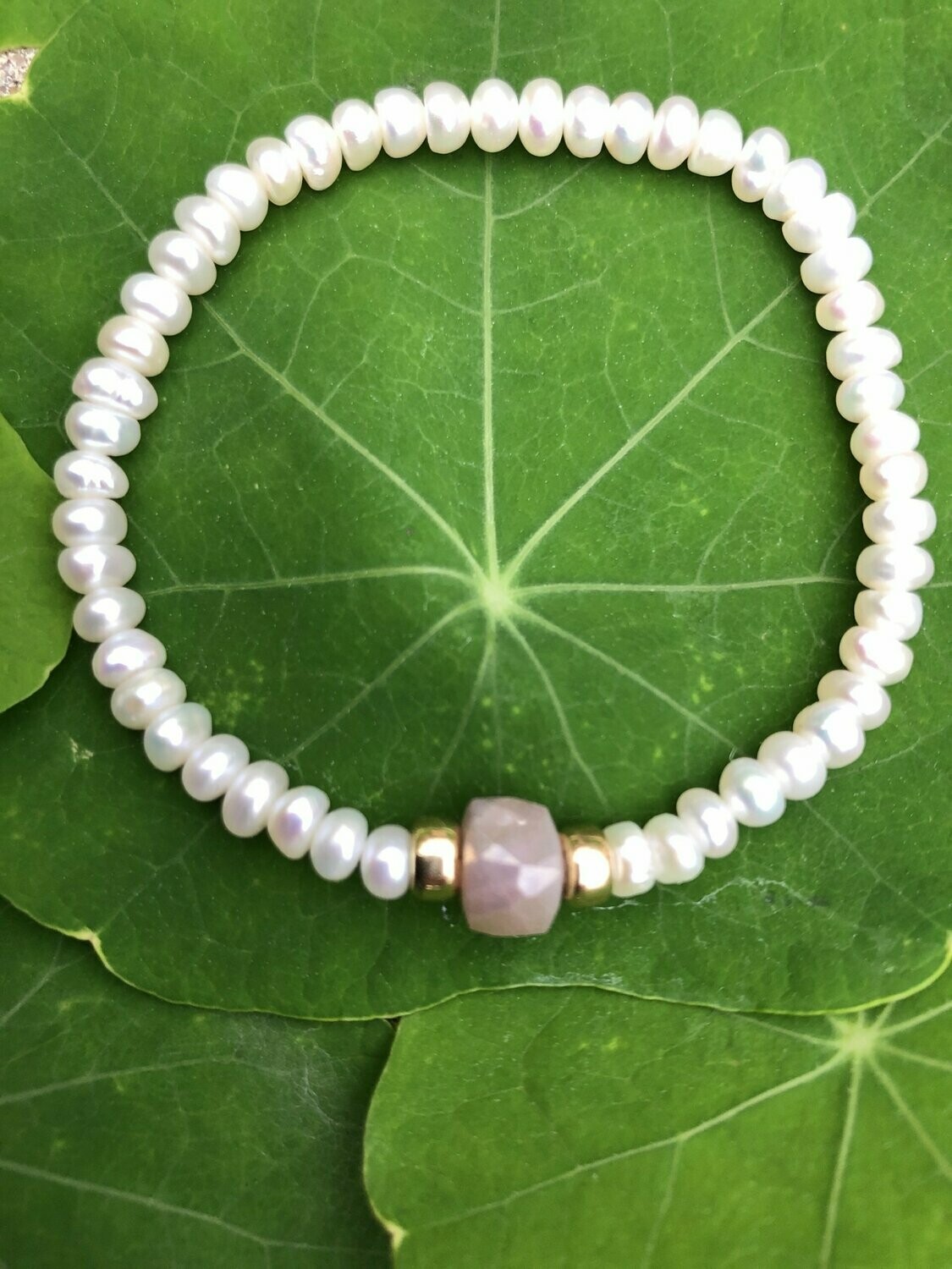 Het oog wordt direct getrokken naar de roze getinte maansteen met zijn bijzondere glans, aan weerszijden geflankeerd door twee gouden kralen, gevolgd door vele butonpareltjes.